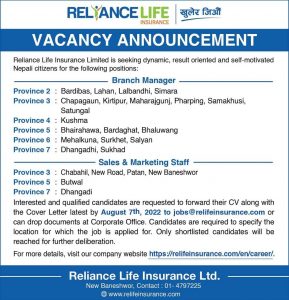 काठमाडौं । रिलायन्स लाइफ इन्स्योरेन्स कम्पनीले ठूलो संख्यामा कर्मचारीको माग गरेको छ । कम्पनीले सातै प्रदेशका लागि ब्रान्च म्यानेजर तथा ३ वटा प्रदेशका लागि भने म्यानेजर सहित केहि संख्यामा बजार प्रतिनिधको समेत माग गरेको छ ।
