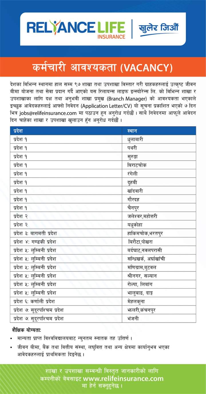काठमाडौं । रिलायन्स लाइफ इन्स्योरेन्स कम्पनीले धेरै संख्यामा कर्मचारीको माग गरेको छ । कम्पनीले सात वटै प्रदेशका विभिन्न शाखा तथा उप शाखा कार्यालयका लागि ब्रान्च म्यानेजरको माग गरेको जनाएको छ ।
