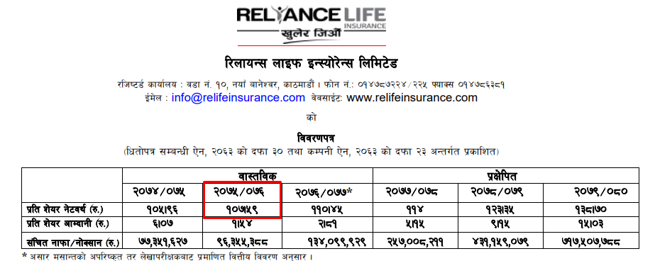 पहिलो कारोवारको लागि कम्पनीले  किताबी मूल्य देखि किताबी मूल्यको तीन गुणासम्म रेञ्ज पाउने गर्छन । रिलायन्स लाईफको आर्थिक वर्ष ७६/७७ असार मसान्तको अपरिष्कृत तर लेखापरीक्षकबाट प्रमाणित वित्तीय विवरण भएकोले कम्पनीको आर्थिक वर्ष ७५/७६ को किताबी मूल्य १०७ रुपैयाँ ५९ पैसाको आधारमा रेञ्ज तय हुने सम्भावना छ।