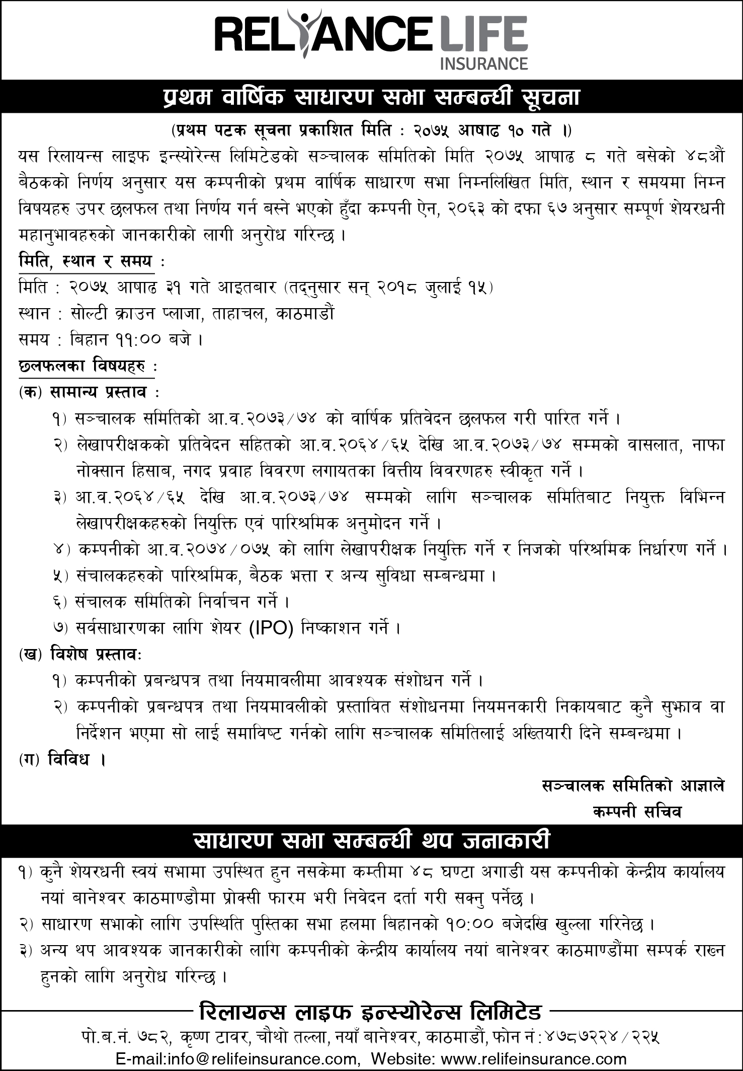 इन्स्योरेन्स खबर/काठमाडौँ: आज रिलायन्स लाईफ इन्स्योरेन्सले प्रथम वार्षिक साधारण सभा गर्दै छ। साधारण सभा सोल्टी क्राउन प्लाजामा आयोजना हुँदै छ। साधारण सभाबाट कम्पनीले आइपिओ निष्कासन गर्ने प्रस्ताव लैजाँदै छ। त्यस्तै यसै साधारण सभा बाट कम्पनीले सञ्चालक समितिको चयन पनि गर्ने छ।