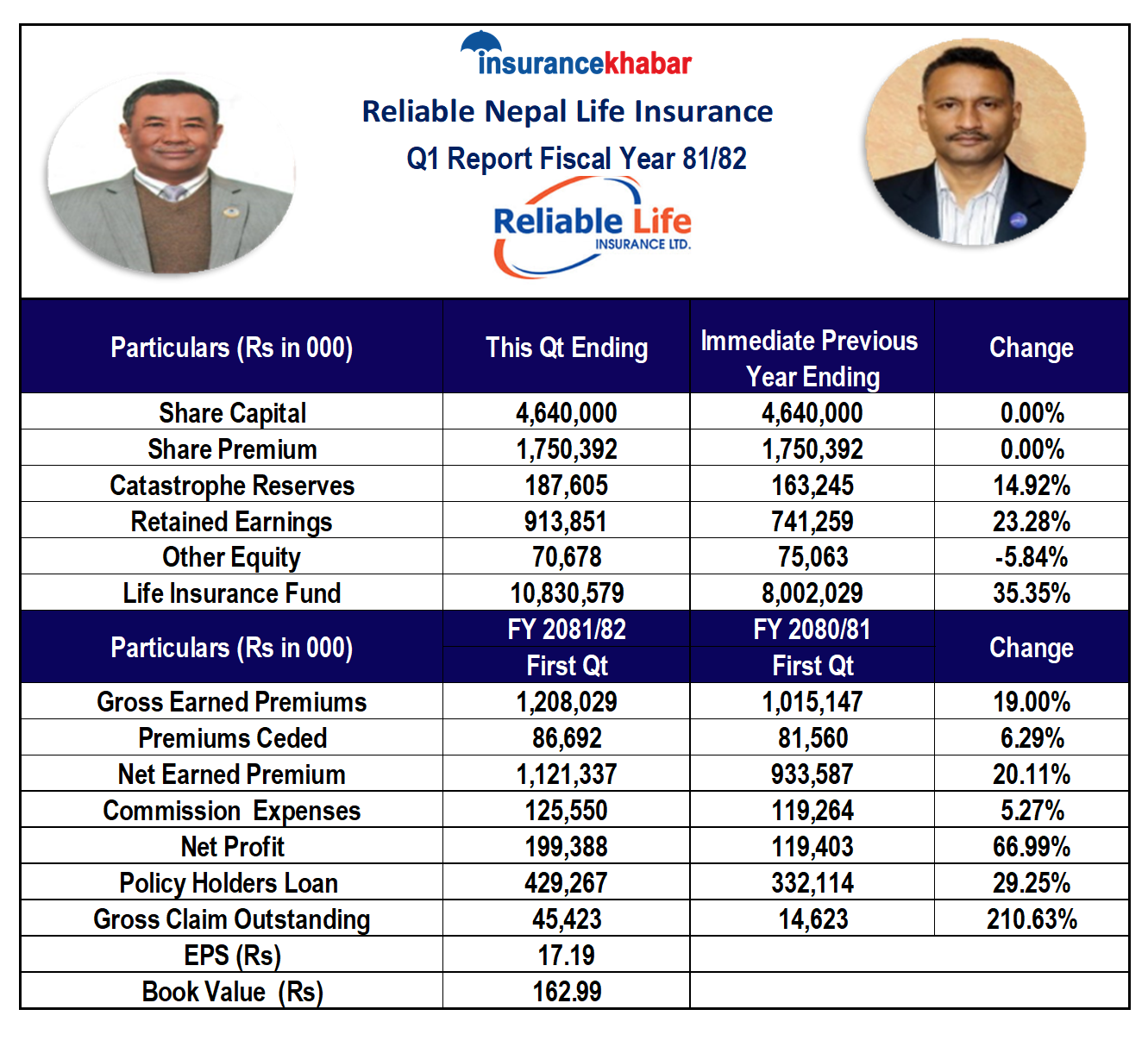 काठमाडौं । रिलायबल नेपाल लाइफ इन्स्योरेन्स लिमिटेडले चालू आर्थिक वर्ष २०८१ /८२को पहिलो त्रैमासको वित्तीय विवरण प्रकाशन गरेको छ । ४ अर्ब ६४ करोड शेयर पूँजी भएको कम्पनीले चालू आर्थिक वर्षको पहिलो त्रैमाससम्ममा १९ करोड ९३ लाख रुपैयाँ नाफा आर्जन गरेको छ । गत आर्थिक वर्षको सोही अवधिमा कम्पनीले ११ करोड ९४ लाख रुपैयाँ नाफा आर्जन गरेको थियो । गत आर्थिक वर्षको सोही अवधिको तुलनामा कम्पनीको नाफा ६६.९९ प्रतिशतले वृद्धि भएको हो ।