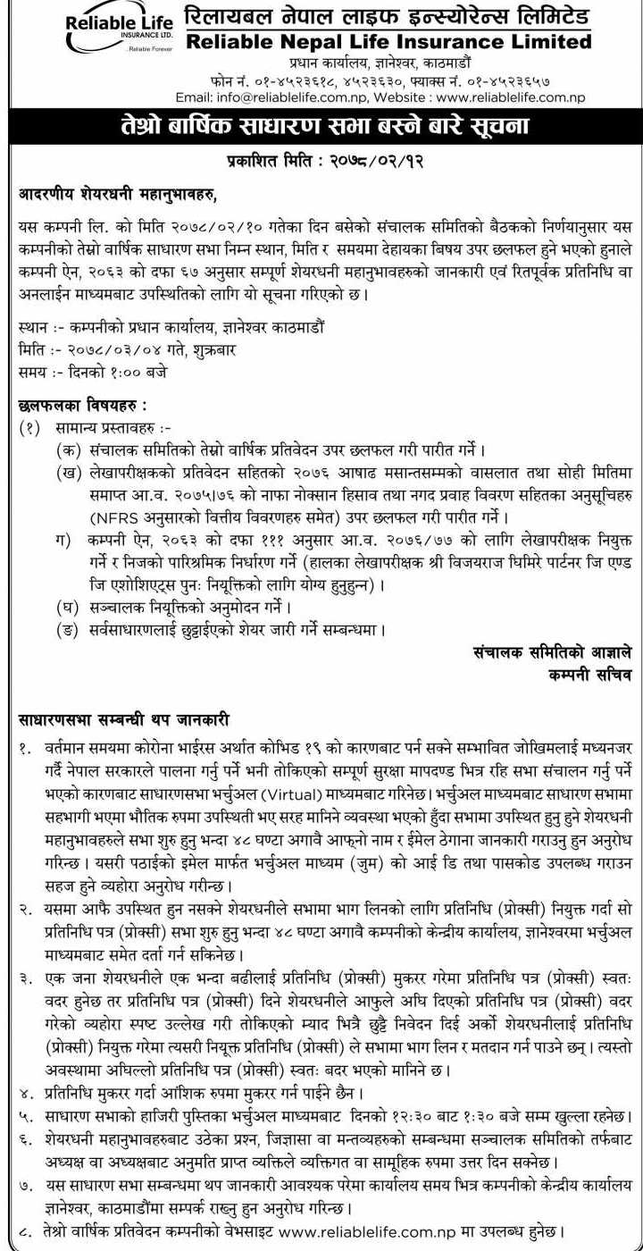काठमाडौं । रिलायबल नेपाल लाइफ इन्स्योरेन्स कम्पनीको तेस्रो वार्षिक साधारणसभा आज हुँदैछ । कम्पनीको जेठ १० गते बसेको संचालक समितिको बैठकले उक्त सभाको मिति तय गरेको हो । सभा कम्पनीको प्रधान कार्यालय ज्ञानेश्वरमा दिनको एक बजे आयोजना हुने कम्पनीले जनाएको छ । अहिलेको असहज परिस्थितिलाई मध्यनजर गर्दै कम्पनीले भर्चुअल माध्यमबाट साधारणसभा सम्पन्न गर्ने भएको छ ।