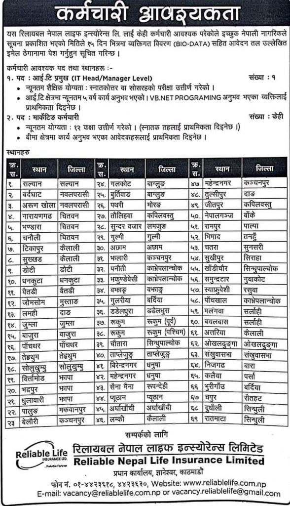काठमडौं । रिलायबल नेपाल लाइफ इन्स्योरेन्स कम्पनीले विभिन्न पदमा कर्मचारी माग गरेको छ। कम्पनीले आई.टि प्रमुखमा एक जना र मार्केटिङ कर्मचारी पदमा केहि लागि कर्मचारी माग गरेको हो ।