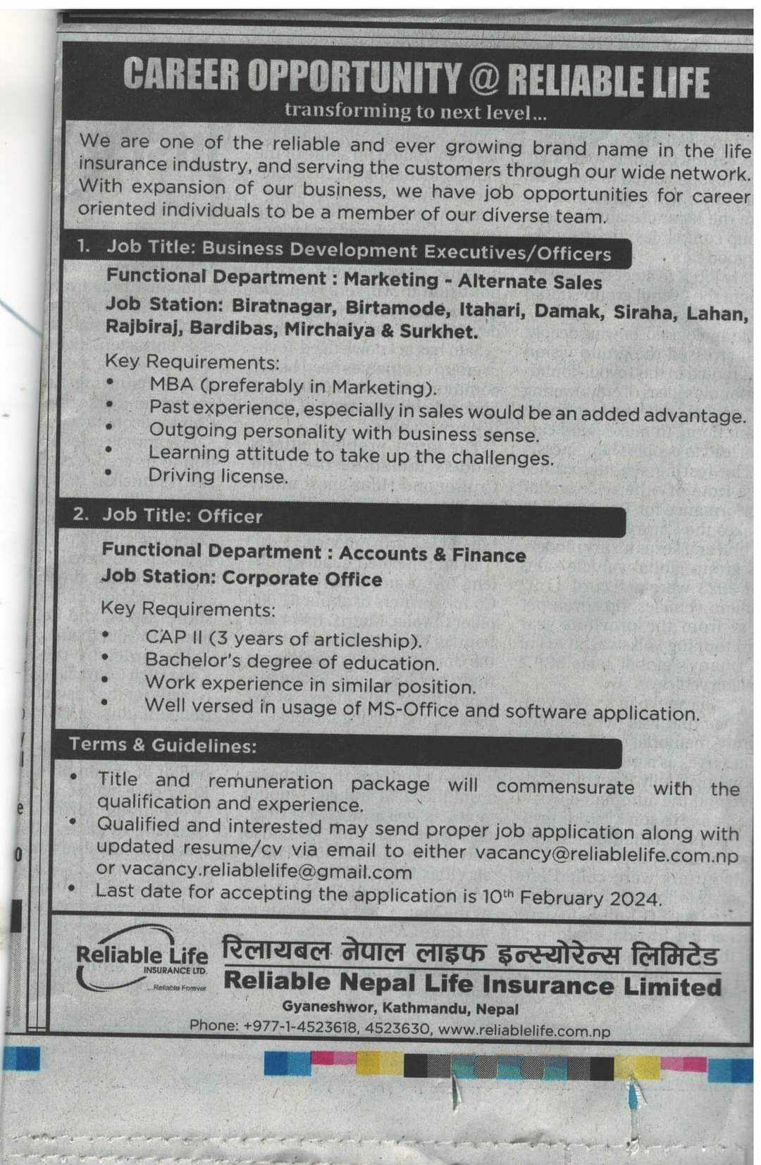 काठमाडौं । रिलायबल नेपाल लाइफ इन्स्योरेन्स कम्पनीले विभिन्न पदका लागि कर्मचारी माग गरेको छ । कम्पनीले विजनेश डेभलपमेन्ट एक्जुकेटिभ अफिसरका लागि केही, अफिसरका लागि केही संख्यामा कर्मचारी माग गरेको हो । कम्पनीले आफ्नो विभिन्न शाखा, उपशाखा तथा हेड अफिसका लागि कर्मचारी माग गरेको हो । ईच्छुक तथा योग्यता पुगेकाले माघ २७ गतेभित्र आवेदन दिनुपर्नेछ ।