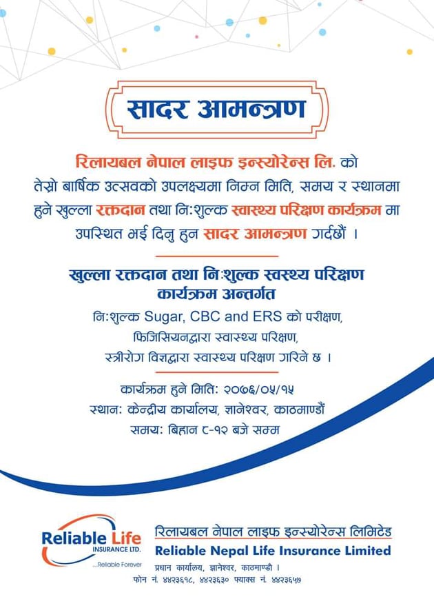 काठमाडौँ । रिलायबल नेपाल लाइफ इन्स्योरेन्स लिमिटेडले खुल्ला रक्तदान तथा नि शुल्क:स्वास्थ्य परिक्षण कार्यक्रमको आयोजना गर्ने भएको छ । इन्स्योरेन्सले तेस्रो वार्षिकोत्सवको अवसरमा आफ्नो केन्द्रिय कार्यालय ज्ञानेश्वरमा, उक्त कार्यक्रम गर्ने भएको हो ।