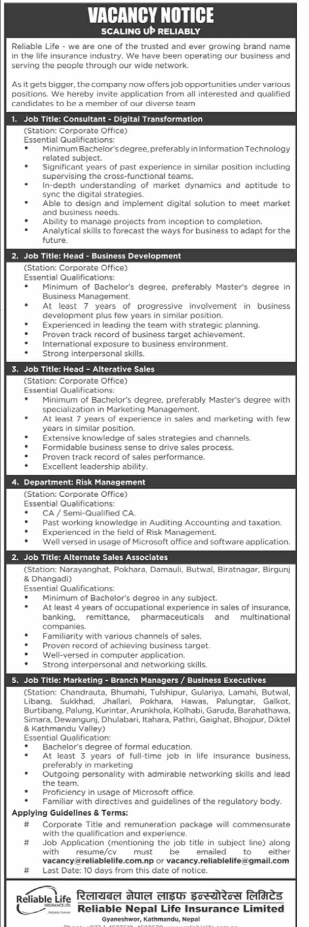 काठमाडौं । रिलायबल नेपाल लाइफ इन्स्योरेन्स कम्पनीले विभिन्न पदहरुका लागि कर्मचारी माग गरेको छ । कम्पनीले डिजिटल ट्रान्सफरमेसनका लागि, विजनेश हेडका लागि, अल्टरटिभ सेल्सका लागि, रिक्स म्यानेजमेन्टका लागि, अल्टरनेट सेल्स एसोसियटका लागि र ब्रान्च म्यानेजर विजनेश एक्जुकेटिभका लागि कर्मचारी माग गरेको हो ।