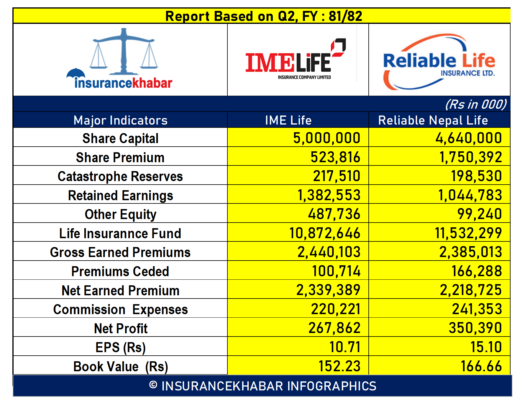 रिटेन्ड अर्निङः आईएमई लाइफको रिटेन्ड अर्निङमा १ अर्ब ३८ करोड २५ लाख रुपैयाँ रहेको छ भने रिलायबल नेपाल लाइफको रिटेन्ड अर्निङमा १ अर्ब ४ करोड ४७ लाख रुपैयाँ रहेको छ।