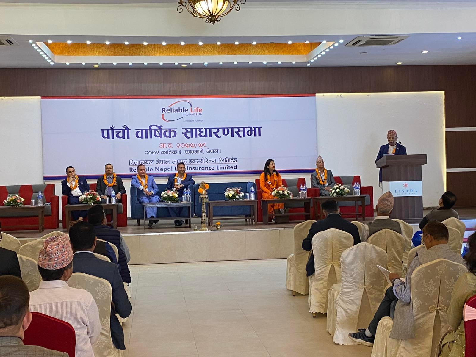 काठमाडौं । रिलायबल नेपाल लाइफ इन्स्योरेन्स कम्पनीले आज पाँचौं वार्षिक साधारण सभा सम्पन्न गरेको छ । उक्त सभा लिसरा ब्यांकेट ज्ञानेश्वर काठमाडौंमा सम्पन्न भएको हो ।