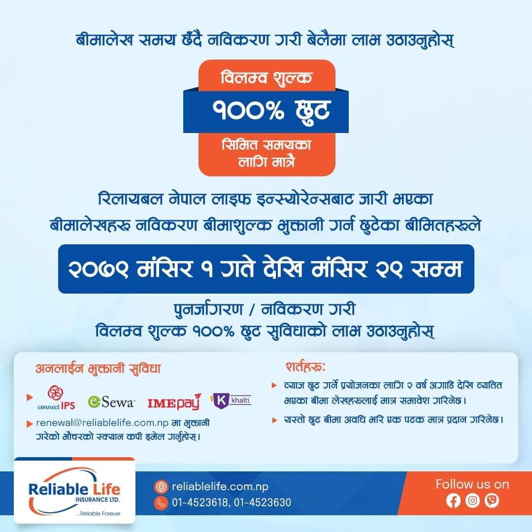 काठमाडौं । रिलायबल नेपाल लाइफले व्यतित बीमालेख नविकरण गर्दा विलम्व शुल्कमा छुट दिने भएको छ । कम्पनीले २०७९ मंसिर १ गतेदेखि मंसिर २९ गते सम्म व्यतित बीमालेख नविकरणमा व्याज छुट दिने जनाएको छ । यस कम्पनीबाट जारी भएका बीमालेखहरु नविरकण बीमा शुल्क भुक्तानी गर्न छुटेका बीमितहरुले कम्पनीले तोकिएको यस समयमा भुक्तानी गरेमा शत प्रतिशत छुट हुनेछ ।
