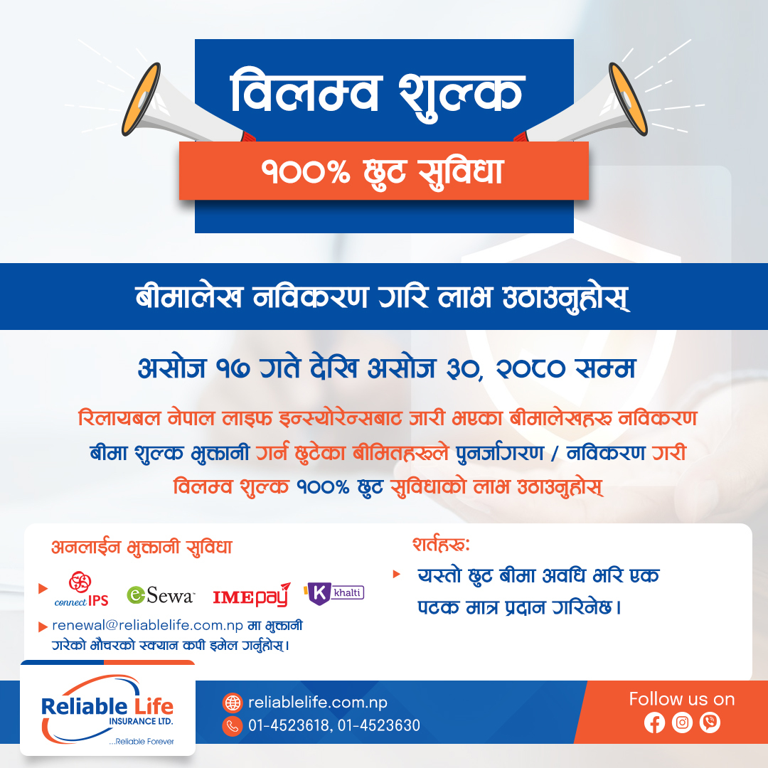 काठमाडौं । रिलायबल नेपाल लाइफ इन्स्योरेन्सले व्यतित बीमालेख पुनर्जागरणमा छुट दिने भएको छ । कम्पनीले २०८० असोज १७ गतेदेखि असोज ३० गतेभित्र पुनर्जागरण गराउँदा बीमितलाई लाग्ने शतप्रतिशत ब्याज छुट दिने व्यवस्था गरेको हो ।