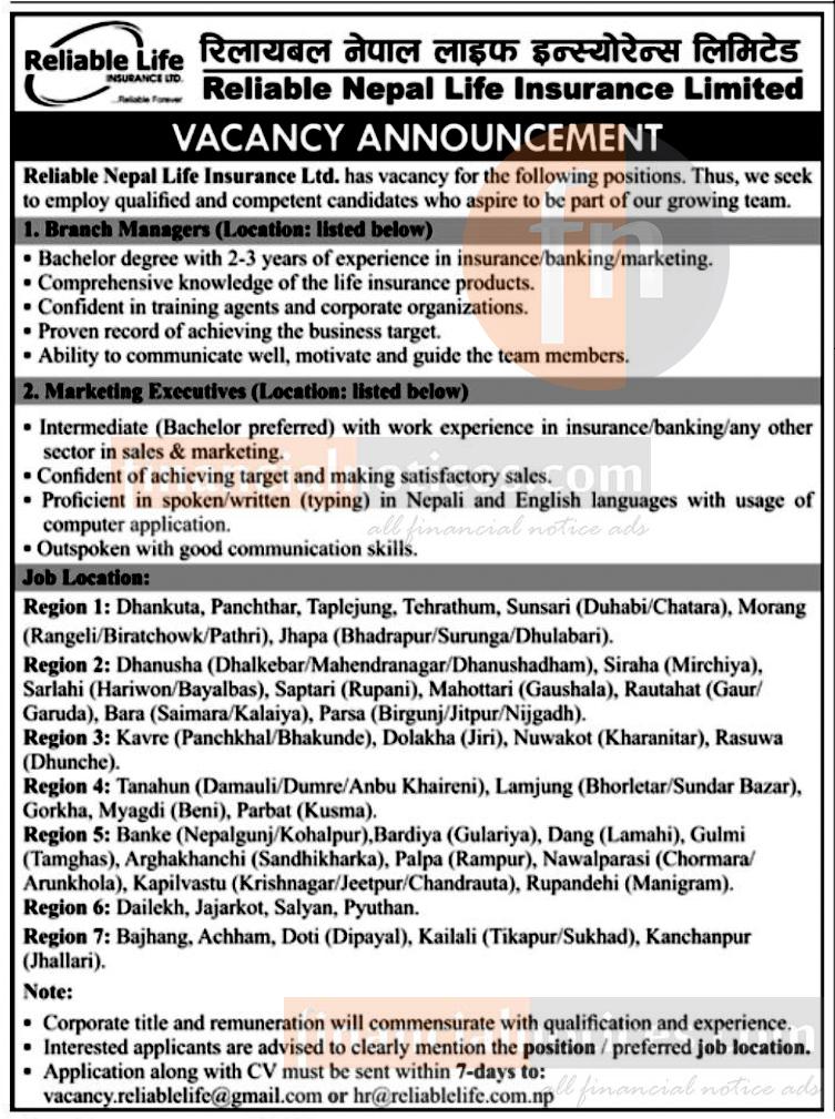 रिलायबल नेपाल लाइफ इन्स्योरेन्स कम्पनीमा रोजगारी खुलेको छ । कम्पनीले एक विज्ञापन जारी गर्दै विभिन्न पदका लागि केही कर्मचारी आहावान गरेको छ । कम्पनीले ब्रान्च म्यानेजर र मार्केटिङ एक्जुकेटिभ पदका लागि कर्मचारी माग गरेको हो ।