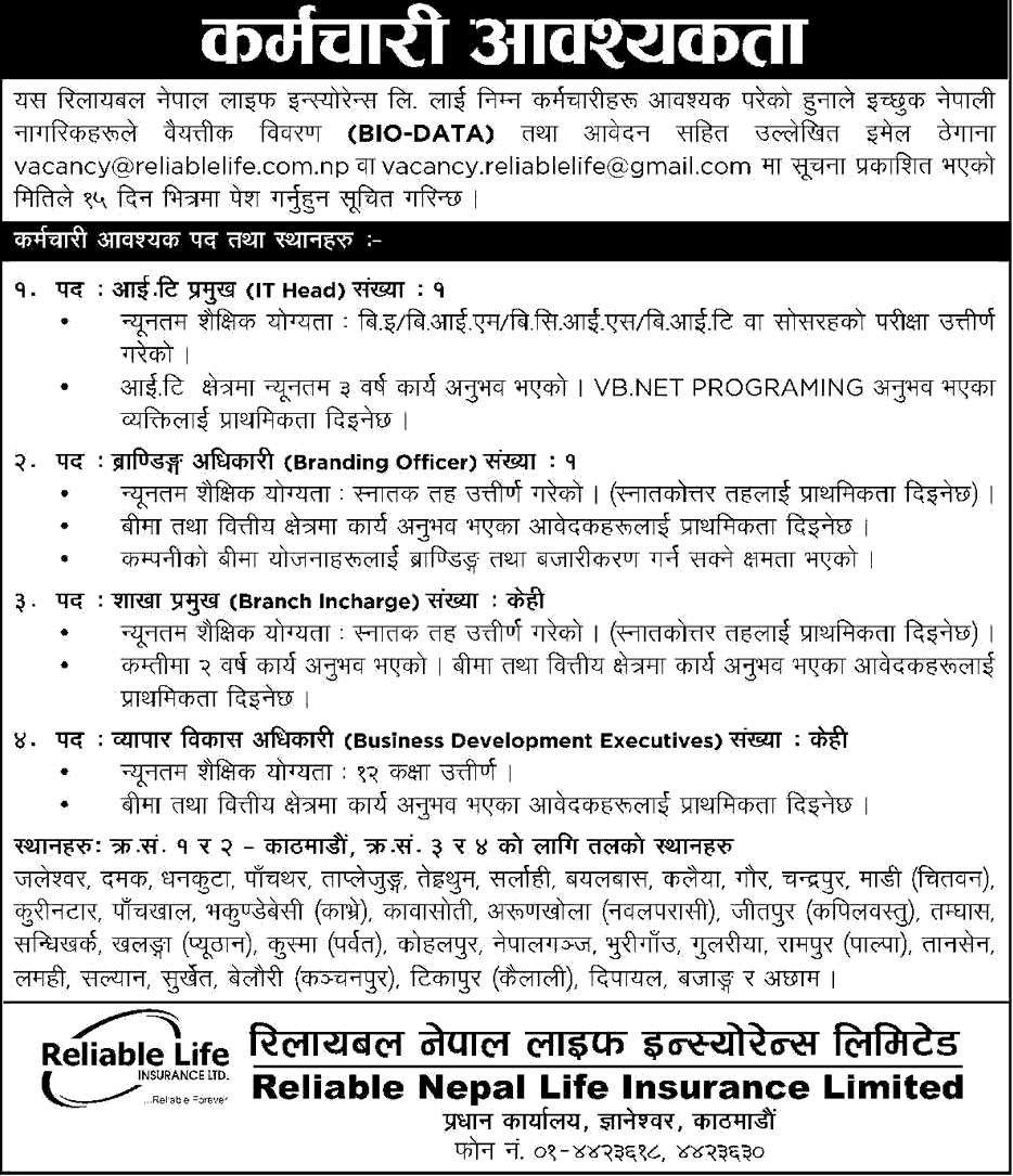 काठमाडौँ । रिलायबल नेपाल लाइफ इन्स्यारेन्स लिमिटेडले विभिन्न पदका लागि कर्मचारी माग गरेको छ । आईटि प्रमुख, ब्राण्डिङ्ग अधिकारी, शाखा प्रमुख र व्यापार विकास अधिकारी पदका लागि कर्मचारी माग गरेको इन्स्योरेन्सले जनाएको छ ।