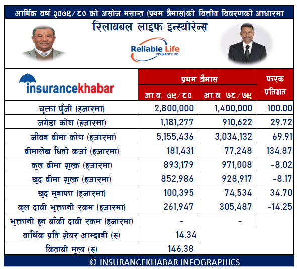 काठमाडौं । रिलायबल लाइफ इन्स्योरेन्सले चालु आर्थिक वर्ष (७९/८० )को पहिलो त्रैमासको वित्तीय विवरण सार्वजनिक गरेको छ । सार्वजनिक गरिएको वित्तीय विवरण अनुसार कम्पनीले प्रथम तीन महिनामा ८९ करोड ३१ लाख कुल बीमा शुल्क आर्जन गरेको छ । गत आर्थिक वर्षको सोही अवधिमा कम्पनीले ९७ करोड १० लाख कुल बीमा शुल्क आर्जन गरेको थियो ।