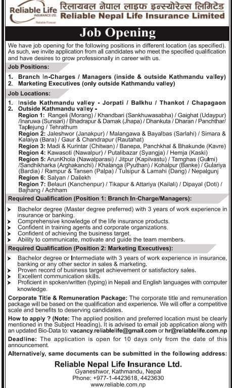 रिलायबल लाईफ इन्स्योरेन्सले उपत्यका भित्र र बाहिर गरी विभिन्न पदेशको लागि ठूलो सङख्यामा कर्मचारी माग गरेको छ । शाखा इन्र्चाज र प्रबन्धकको कम्तीमा तिन बर्षको बैंक वा इन्स्योरेन्स क्षेत्रमा काम गरेको अनुभवी कर्मचारीहरु माग गरको छ ।