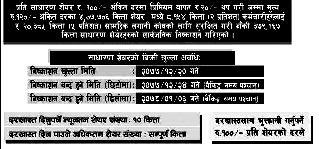 कम्पनीको प्राथमिक शेयरमा ५० गुणा भन्दा धेरैको आवेदन परिसकेकाले १० कित्ता भन्दा धेरैको लागि आवेदन दिनु पर्दैन । सर्वसाधारणका लागि छुट्टाइएको शेयर मध्येबाट ३७ लाख ९१ हजार ६७० जनाले मात्रै १० कित्ताका दरले शेयर प्राप्त गर्न सक्छन् । तर अहिलेसम्ममा १३ लाख भन्दा धेरैको आवेदन परिसकेको छ ।