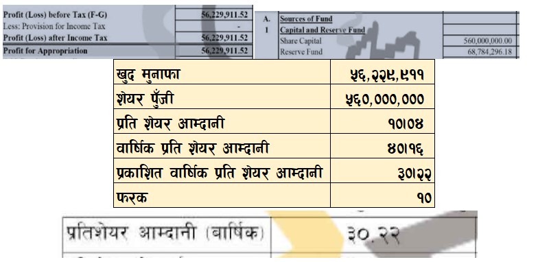 काठमान्डौ। रैराङ हाइड्रोपावरले आर्थिक वर्ष ७७/७८ को असोज महिनासम्मको वित्तीय विवरण प्रकाशित गर्दा कम्पनीले आयकर पश्चात ५ करोड ६२ लाख खुद नाफा देखाएकोमा कम्पनीको शेयर पुँजी ५६ करोडको आधारमा प्रति शेयर आम्दनी गणना गर्दा वार्षिक प्रति शेयर आम्दानी ४० रुपैयाँ हुनु पर्नेमा कम्पनीले मात्र ३० रुपैयाँ वार्षिक प्रति शेयर आम्दनी प्रकाशन गरेको छ।