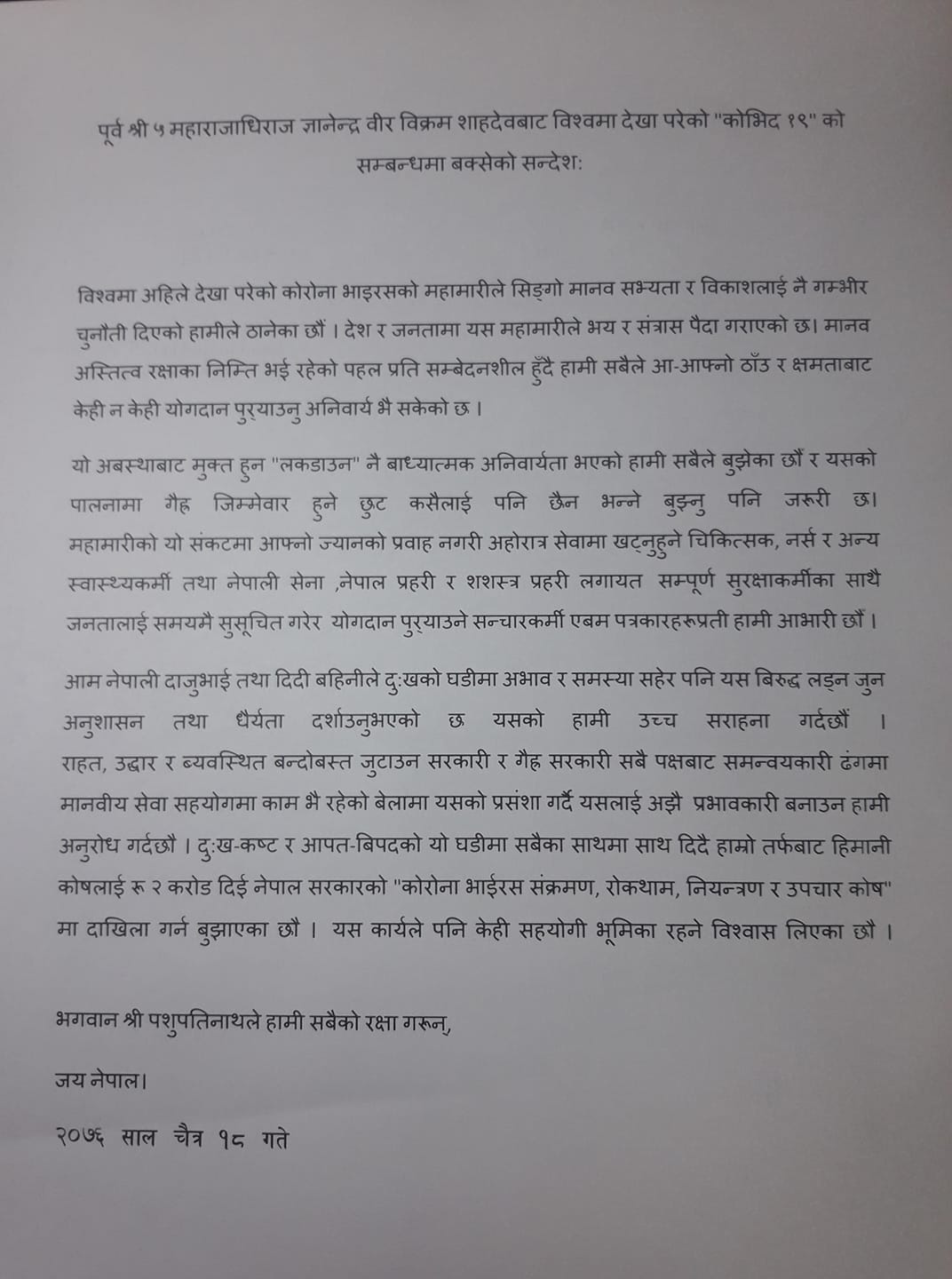 पूर्व राजा शाहले बक्तव्यमा भनेका छन्, ‘दुःखकष्ट र आपत–बिपदको यो घडीमा सबैका साथमा साथ दिदै हाम्रो तर्फबाट हिमानी कोषलाई रू २ करोड दिई नेपाल सरकारको “कोरोना भाईरस संक्रमण, रोकथाम, नियन्त्रण र उपचार कोष“ मा दाखिला गर्न बुझाएका छौ । यस कार्यले पनि केही सहयोगी भूमिका रहने विश्वास लिएका छौ ।’ साथै ज्ञानेन्द्र शाले लकडाउनको समर्थन गर्दै यसको विकल्प नभएको समेत बताएका छन् ।