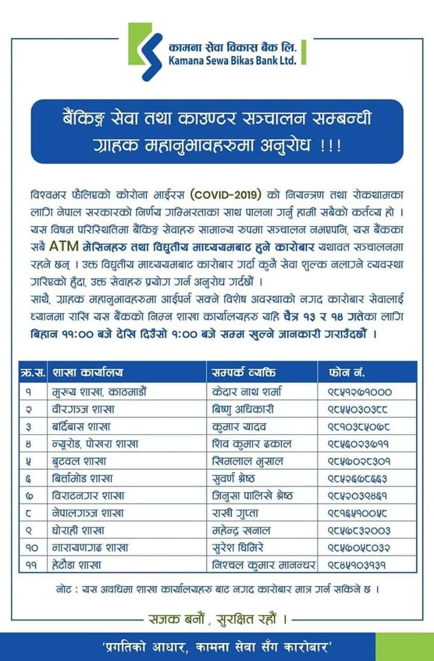 देश लक डाउन भइरहदा पनि कामना सेवा विकास बैंकका ११ शाखा कार्यालय खुला हुने बैंकले जनाएको छ । बैंकक खुला रहने शाखाहरुमा दुई वटा शाखा कार्यालय उपत्यकाभित्रका हुन भने बाँकि ९ वटा शाखा कार्यालय उपत्यका बाहिरका हुन् ।