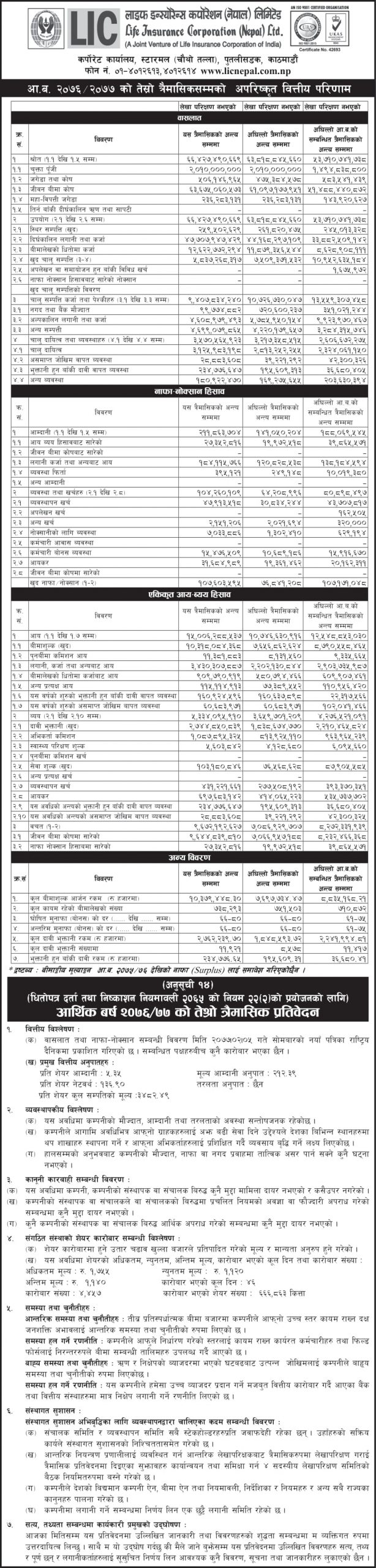 लाइफ इन्स्योरेन्स कर्पोरेशन नेपालले चालु आर्थिक वर्ष (७६/७७)को तेश्रो त्रैमासको वित्तिय विवरण प्रकाशन गरेको छ । लकडाउनको समयमा पनि कम्पनीले आक्रामक व्यापार गर्दै कुल बीमा शुल्क आर्जन १७ प्रतिशतले वृद्धि गर्न सफल भएको छ। चालु आर्थिक वर्षको तेश्रो त्रैमाससम्म कम्पनीले १० अर्ब ३७ करोड कुल बीमा शुल्क आर्जन गरेकोमा अघिल्लो आर्थिक वर्षको तेश्रो त्रैमाससम्म कम्पनीले ८ अर्ब ८३ करोड कुल बीमा शुल्क आर्जन गरेको छ।