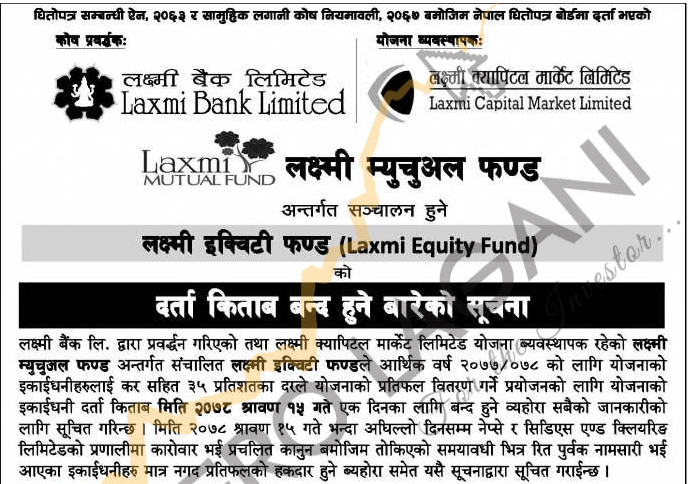 काठमाडौं । लक्ष्मी म्युचुअल फण्डद्वारा सञ्चालित लक्ष्मी इक्विटी फण्डको प्रतिफल सुरक्षित गर्ने आज अन्तिम दिन रहेको छ । फण्डले प्रतिफल वितरण प्रयोजनको लागि भोलि साउन १५ गते बुक क्लोज गर्ने निर्णय गरेको छ । त्यसकाण बुक क्लोजको अघिल्लो दिन अर्थात साउन १४ गतेसम्मका कायम शेयरधनीले मात्र प्रतिफलको हकदार बन्न सक्नेछन् ।