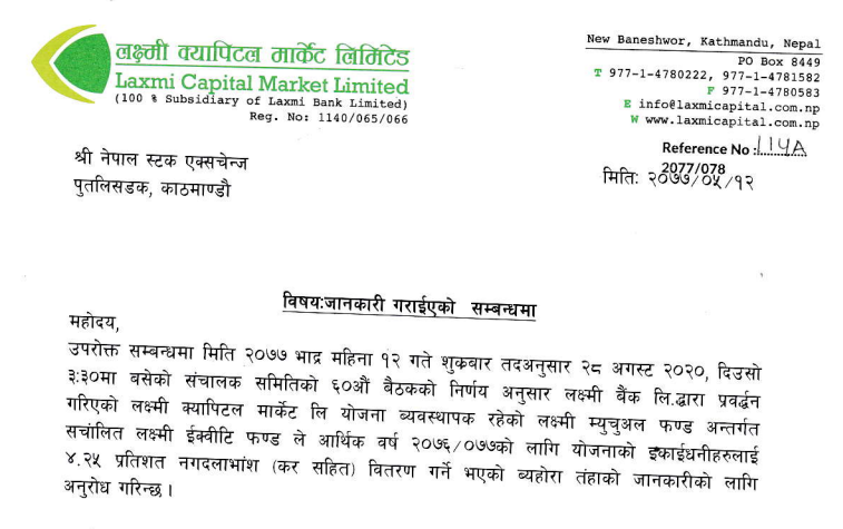 काठमाडौं । लक्ष्मी म्युचुअल फण्ड अन्तर्गत संचालित लक्ष्मी इक्विटी फण्डले लाभांश घोषणा गरेको छ । योजना ब्यबस्थापक लक्ष्मी क्यापिटलको शुक्रबार बसेको संचालक समितिको बैठकले आर्थिक वर्ष ७६/७७ को लागि लाभांश घोषणा गरेको हो ।