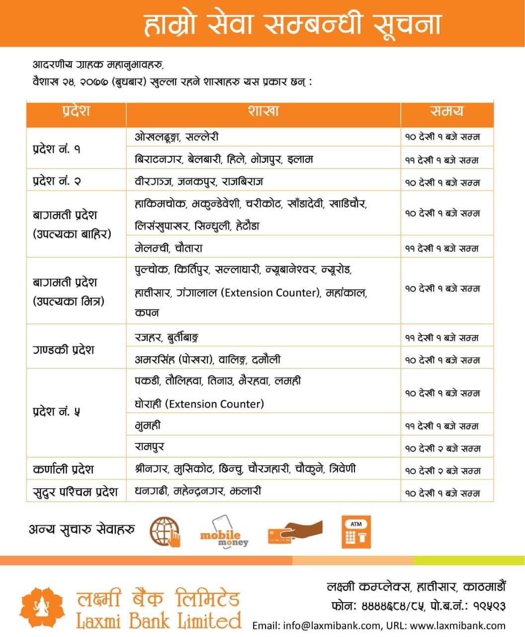 लक्ष्मी बैंकको आज खुला रहने शाखा कार्यालयहरु