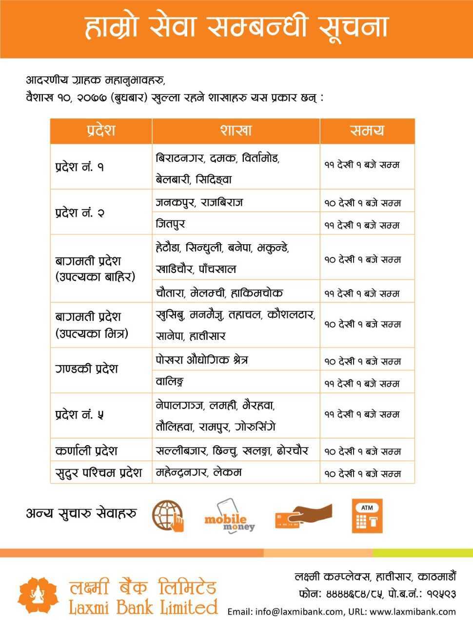 काठमाडौं । लक्ष्मी बैंकले आज उपत्यकाभित्र तथा उपत्यका बाहिरका विभिन्न शाखा कार्यालयबाट सेवा दिने भएको छ । बैंक विहान ११ बजेदेखि दिउँसो १ बजेसम्मका लागि खुल्ला हुने जानकारी गराइएको छ ।