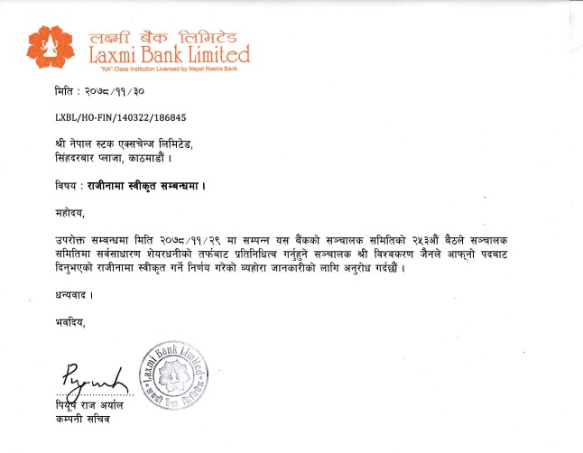 काठमाडौं । लक्ष्मी बैंकको सञ्चालक समितिमा सर्वसाधारण शेयरधनीको तर्फबाट प्रतिनिधित्व गरेका विश्वकरण जैनले राजीनामा दिएका छन् ।कम्पनीको फागुन २९ गते बसेको सञ्चालक समितिको बैठकले जैनले दिएको राजीनामा स्वीकृत गरेको हो ।