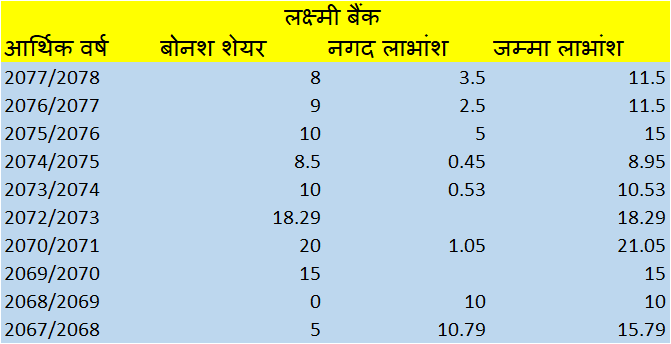 काठमाडौं । लक्ष्मी बैंकले गत आर्थिक वर्ष २०७७/७८ को मुनाफाबाट ११.५ प्रतिशत लाभांश घोषणा गरेको छ । आज बिहीबार बसेको सञ्चालक समितिको बैठकले चुक्ता पूँजीको ८ प्रतिशत बोनश शेयर र कर प्रयोजन सहित ३.५ प्रतिशत नगद लाभांश दिने प्रस्ताव गरेको हो ।