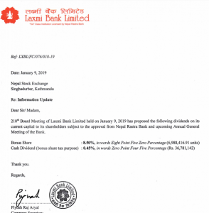 लक्ष्मी बैंकले ८ दशमलव ५० प्रतिशत बोनस सेयर दिने भएको छ । बुधबार बसेको बैंकको सञ्चालक समितिको बैंठकले ८.५० प्रतिशत बोनस शेयर र उक्त बोनसमा लाग्ने करका लागि ०.४५ प्रतिशत नगद लाभांश प्रस्ताव गर्ने निर्णय गरेको हो ।
