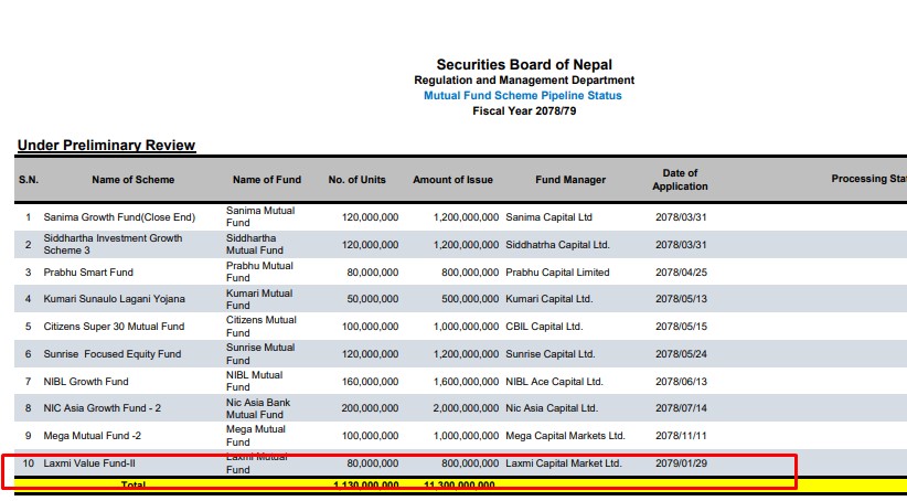 फण्डले प्रतिइकाई १० रुपैयाँको १८ करोड इकाई निष्काशन गर्नका लागि सेबोनमा निवेदन दिएको हो । योजना व्यवस्थापक लक्ष्मी क्यापिटल मार्केट्स लिमिटेड रहेको छ ।