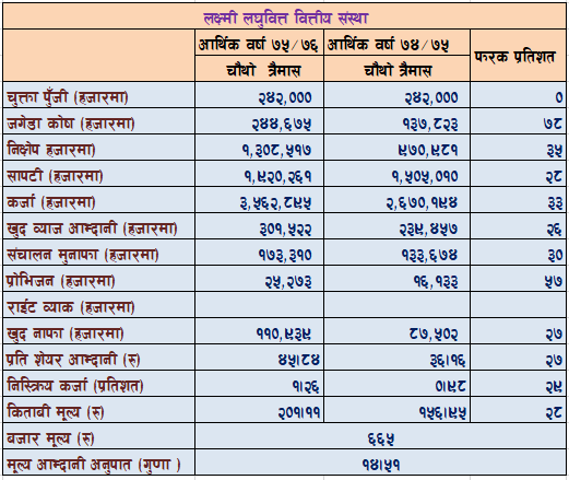 लक्ष्मी लघुवित्त वित्तीय संस्थाले आर्थिक वर्ष २०७५/ ७६ को चौथो त्रैमासको वित्तीय विवरण प्रकाशित गरेको छ । लघुवित्तले आर्थिक वर्ष २०७५ /७६ को १२ महिनामा ११ करोड ९ लाख रुपैयाँ खुद व्याज आमदानी गरेको छ । गत आर्थिक वर्षको सोही अवधिमा लघुवित्तले ८ करोड ७५ लाख रुपैयाँ खुद व्याज आम्दानी गरेको थियो । गत आर्थिक वर्षको सोही अवधिको तुलनामा लघुवित्तको नाफा २७ प्रतिशतले बढी हो ।