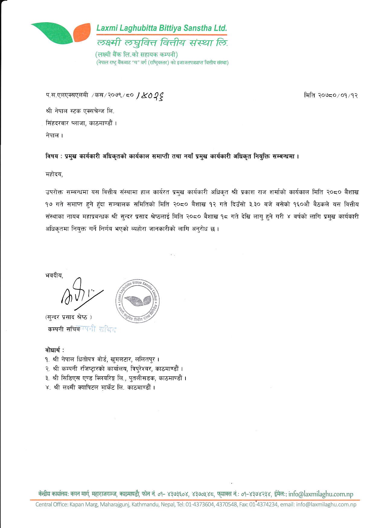 काठमाडौं । लक्ष्मी लघुवित्तको प्रमुख कार्यकारी अधिकृत (सिइओ)मा सुन्दर प्रसाद श्रेष्ठ नियुक्त भएका छन्। कम्पनीको बैशाख १२ गते बसेको कम्पनीको संचालक समितिको बैठकले श्रेष्ठलाई ४ वर्षको लागि सिइओमा नियुक्त गरेको हो ।