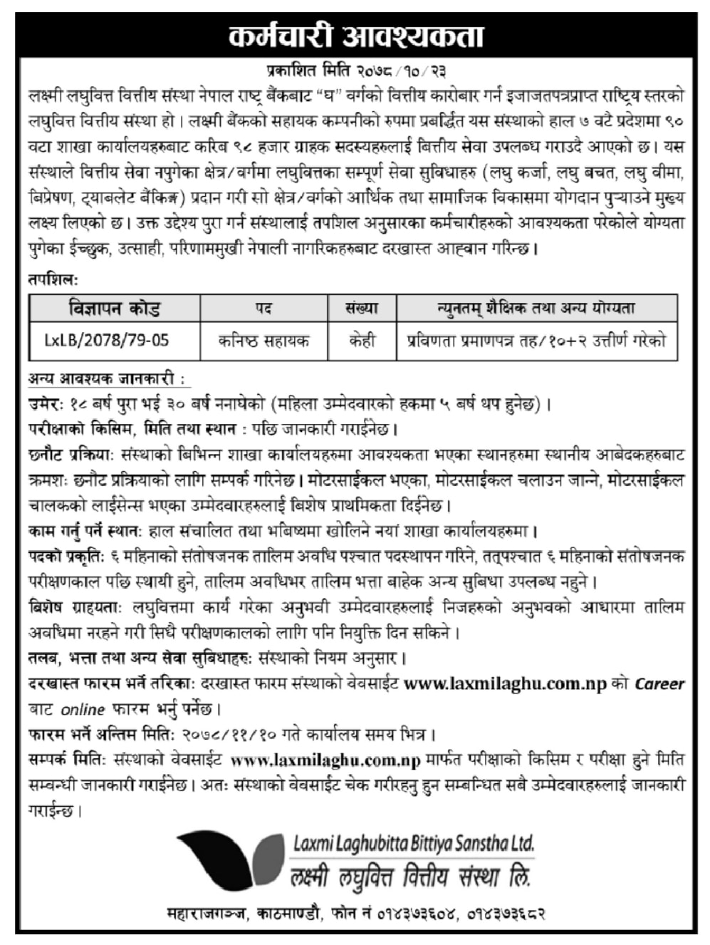 लक्ष्मी लघुवित्तमा रोजगारीको अवसर, आवेदन दिन १० दिन बाँकि