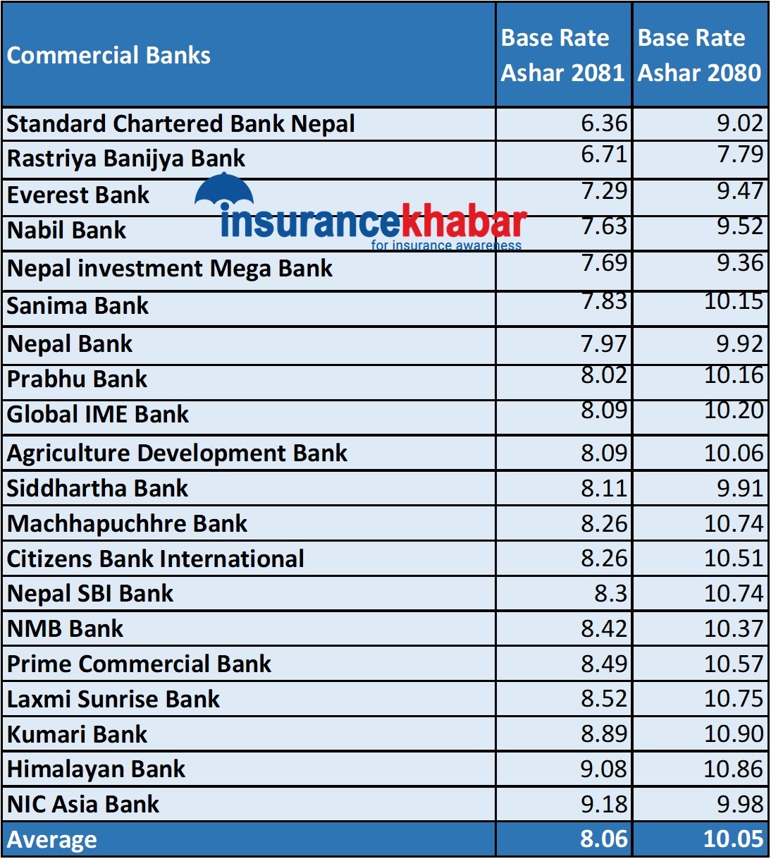 आर्थिक वर्ष २०८०।८१ को वार्षिक वित्तीय विवरण हेर्दा वाणिज्य बैंकहरुको आधारदर ६ प्रतिशतसम्म झरेको देखिन्छ। हाल सञ्चालनमा रहेका २० वटा वाणिज्य बैंकको २०८१ असारमा औसत आधारदर ८.०६ प्रतिशत रहेको छ। २०८० असारमा बैंकहरुको औसत आधारदर १०.०५ प्रतिशत रहेको थियो। यो १ वर्षको अवधिमा बैंकहरुको औसत आधारदर करिब २ प्रतिशतले घटेको देखिन्छ।