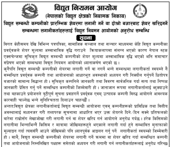 यसै क्रममा आयोगले आज एउटा सर्वजनिक सूचना जारी गर्दै लगानीकर्ताहरुलाई जोखिम मूल्याङ्कन गरेर मात्रै लगानी गर्न अनुरोध गरेको छ । विद्युत क्षेत्रका लगानीकर्तालाई विद्युत सम्बन्धी आयोजना एवम् कम्पनीहरुको प्राविधिक तथा वित्तीय अवस्थालाई मध्यनजर गरी तथ्यपरक सूचनामा आधारित भएर उक्त शेयरले दिने दिन सक्ने प्रतिफलको बारेमा राम्रो सँग लेखाजोखा गरी लगानी गर्न वा शेयर खरिद गर्न आयोगले अनुरोध गरेको हो । हरेक किसिमको लगानीमा भिन्नाभिन्नै किसिम र मात्रामा जोखिमहरु हुने भएकाले लगानी गर्दा हुने सम्भावित मुनाफाको मूल्याङ्कन गर्दा त्यस सँगै आउने जोखिम पनि ध्यानपुर्वक आकलन गर्नु पर्ने लगानीकर्ता स्वयंमको जिम्मेवारी भएको आयोगको धारणा छ ।