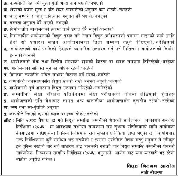 आयोजले गत बैशाख १५ गते सार्वजनिक गरेको बिद्युत सम्बन्धि कम्पनीको शेयरको सार्बजनिक निष्काशन सम्बन्धि निर्देशिका,२०७६ मा आबश्यक संशोधन सम्बन्धमा राय सुझाब प्रतिक्रियाको लागि आयोगको वेबसाइटमा राखिएकोमा विभिन्न किसिमका राय सुझाब प्रतिक्रिया प्राप्त भएको छ । आयोगबाट उक्त निर्देशिकामा कुनै संशोधन भइ नसकेको र त्यसमा उल्लेखित विषय बस्तु अनुसार नै स्वीकृत हुने एकिन नरहेको आयोगले प्रष्ट पारेको छ ।