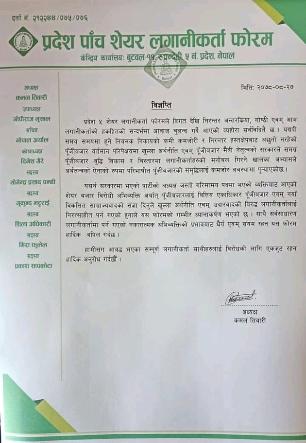 विज्ञप्तिमा भनिएको छ समग्र पूँजीबजारको विकास र विस्तारमा लगानीकर्ताहरुको मनोबल गिर्ने खालको अभ्यास खुल्ला अर्थ नीति एवं पूँजीबजार मैत्री नेतृत्वको सरकारबाट भइरहेको छ ।
