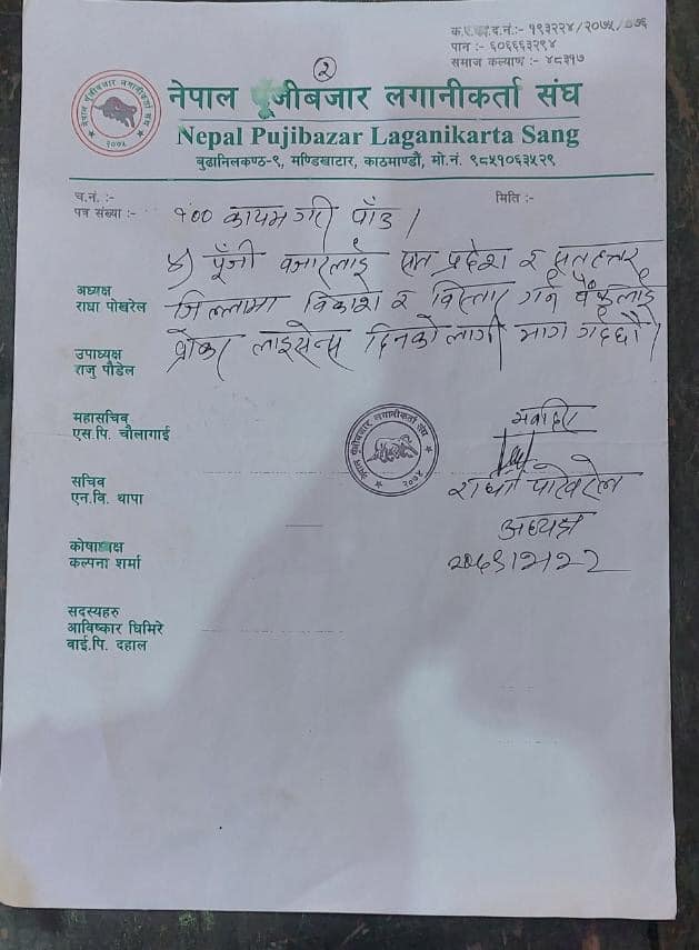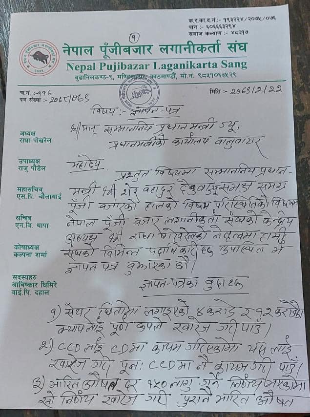 काठमाडौं । नेपाल पूँजी बजार लगानीकर्ता संघले प्रधानमन्त्री शेर बहादुर देउवालाई भेटेर शेयर बजार सम्बन्धी ५ बुँदे ज्ञापनपत्र बुझाएको छ । अध्यक्ष राधापोख्रेलको संयोजकत्वमा गएका लगानीकर्ताले प्रधानमन्त्री समक्ष शेयर धितोमा लगाइएको ४ करोड र १२ करोडको क्यापलाई पूर्ण रुपले खारेज गर्न माग राखेका छन् ।