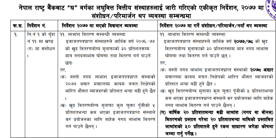राष्ट्र बैंकले लघुवित्त वित्तीय संस्थाहरुलाई वार्षिक २० प्रतिशत भन्दा बढि लाभांस वितरण गर्नु परेमा प्रस्तावित लाभांसको ५० प्रतिशतले हुने रकम साधारण जगेडा कोषमा जम्मा गर्नु पर्ने व्यवस्था गरिदिएको छ । गएको वर्ष राष्ट्र बैंकले लघुवित्त वित्तिय संस्थालाई खुद वितरणयोग्य मुनाफाको ३० प्रतिशतसम्म मात्रै नगद लाभांस घोषणा तथा वितरण गर्न पाउने व्यवस्था गरिदिएको थियो । तर यस वर्ष उक्त ३० प्रतिशतको सिलिङलाई २० प्रतिशतमा झारदिएको छ । यदि २० प्रतिशत भन्दा धेरै लाभांस वितरण गर्नु पर्नेमा प्रस्तावित लाभांसको ५० प्रतिशत जगेडा कोषमा जम्मा गर्नु पर्ने गरि कडाइ गरिदिएको छ ।