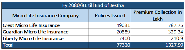 यसैगरी जेठसम्म गार्डियन माइक्रो लाइफले २० हजार ८८९ वटा बीमालेख जारी गर्दै ३ करोड २९ लाख ३४ हजार रुपैयाँ कुल बीमाशुल्क आर्जन गरेका छन्।