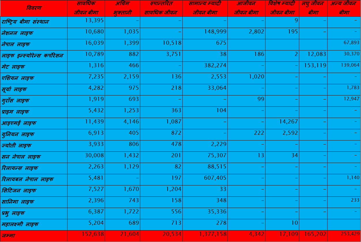 विशेष म्यादी जीवन बीमा योजना भने जम्मा १७ हजार १०४ वटा मात्रै पोलिसी बिक्री गरेको देखिन्छ । यस बापत उनिहरुले २ करोड ५४ लाख रुपैयाँ मात्रै बीमा शुल्क आर्जन गरेका छन् । अन्य विविध किसिमका जीवन बीमा योजना हेर्यो भने लगभग ५ हजार २७ वटा पोलिसी बिक्री भएको देखिन्छ । जसबाट ७३ करोड ९५ लाख रुपैयाँ बीमा शुल्क आर्जन गरेका छन् । कम्पनीहरुले चालु आर्थिक वर्षको पहिलो त्रैमाशिक अवधिमा ११ अर्ब २६ करोड रुपैयाँको दाबी भुक्तानी गरेका छन् ।