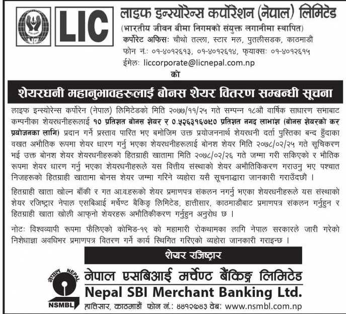 कम्पनीले साधारण सभाको प्रयोजनका लागि बुक क्लोजको समयमा शेयर अभौतिकीकरण गराएका शेयरधनीको हितग्राही खातामा उक्त बोनस शेयर जम्मा गरिदिएको जनाएको छ । कम्पनीको सेयर रजिष्ट्रारमा नेपाल एसबिआई मर्चेण्ट बैंकिङ लिमिटेड रहेको छ ।