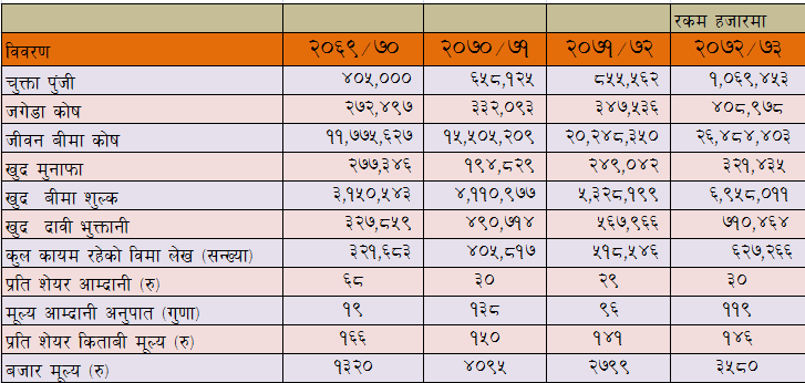 - कम्पनीको जीवन बीमा कोषमा २८ प्रतिशतले वृद्धि भएर ४६ अर्ब ४ करोड रुपैयाँ पुगेको छ । त्यस्तै, महाविपति जगेडाकोष कोषमा कम्पनीले १४ करोड ४३ लाख रुपैयाँ संचित छ ।