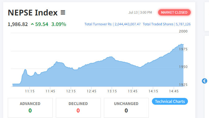 बुधबार नेप्से सूचक ५९.५४ अंकले सुधार हुँदा २ अर्ब ४ करोड रुपैयाँको कारोबार भएको छ । नेप्से सूचक ३.०९ प्रतिशतले बढेर १९८६ अंक कायम भएको छ । आज चार वटा कम्पनीको शेयर मूल्य सर्वाधिक धेरै बढ्ने क्रममा सर्किट लागेको छ । सर्किट लाग्नेमा नेपाल फाइनान्स, रिलायन्स फाइनान्स, सिइडिबी हाइड्रो र कर्पोरेट डेभलपमेन्ट बैंक छन् । आज १८५ वटा कम्पनीको शेयर मूल्यमा सुधार हुँदा ५ वटाको भने घटेको छ । सर्वाधिक धेरै शिवम सिमेन्टको ९ अर्ब रुपैयाँको कारोबार भएको छ । मुनाफामा दोस्रो स्थानमा देखिएको एनआईसी एशियाको पनि दोस्रो धेरै कारोबार भएको छ । लगानीकर्ताको सर्वाधिक धेरै आकर्षण फाइनान्स र विकास बैंकमा देखिएको छ ।