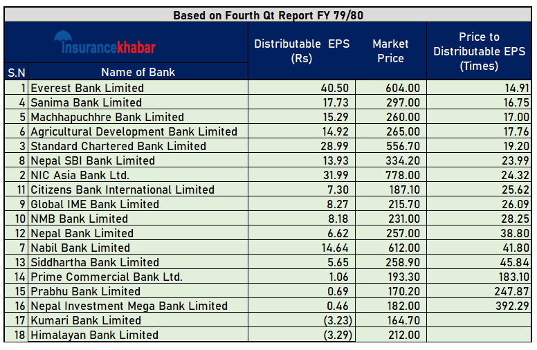 नेप्सेमा हाल कारोबारमा देखिएका १८ वाणिज्य बैंकमध्ये लाभांश क्षमताको आधारमा एभरेष्ट बैंक “अण्डरभ्यालुड” देखिएको छ । एभरेष्ट बैंकको लाभांश क्षमता ४० दशमलव ५० हुँदा कम्पनीको बजार मूल्य ६०४ रुपैयाँ रहेको छ ।