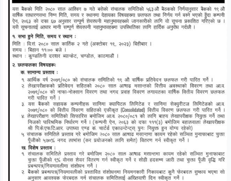 सभाले हाल कायम चुक्ता पूँजीको ९ प्रतिशतका दरले बोनश शेयर र सोको कर प्रयोजनार्थ सहित गरी ५ दशमलव ७० प्रतिशतका दरले नगद लाभांश वितरण गर्ने विशेष प्रस्ताव पारित गर्नेछ। सभाले गत आर्थिक वर्षको नाफा, नोक्सान, हिसाव वित्तीय विवरणमाथि छलफल गरी पारित गर्नेछ ।
