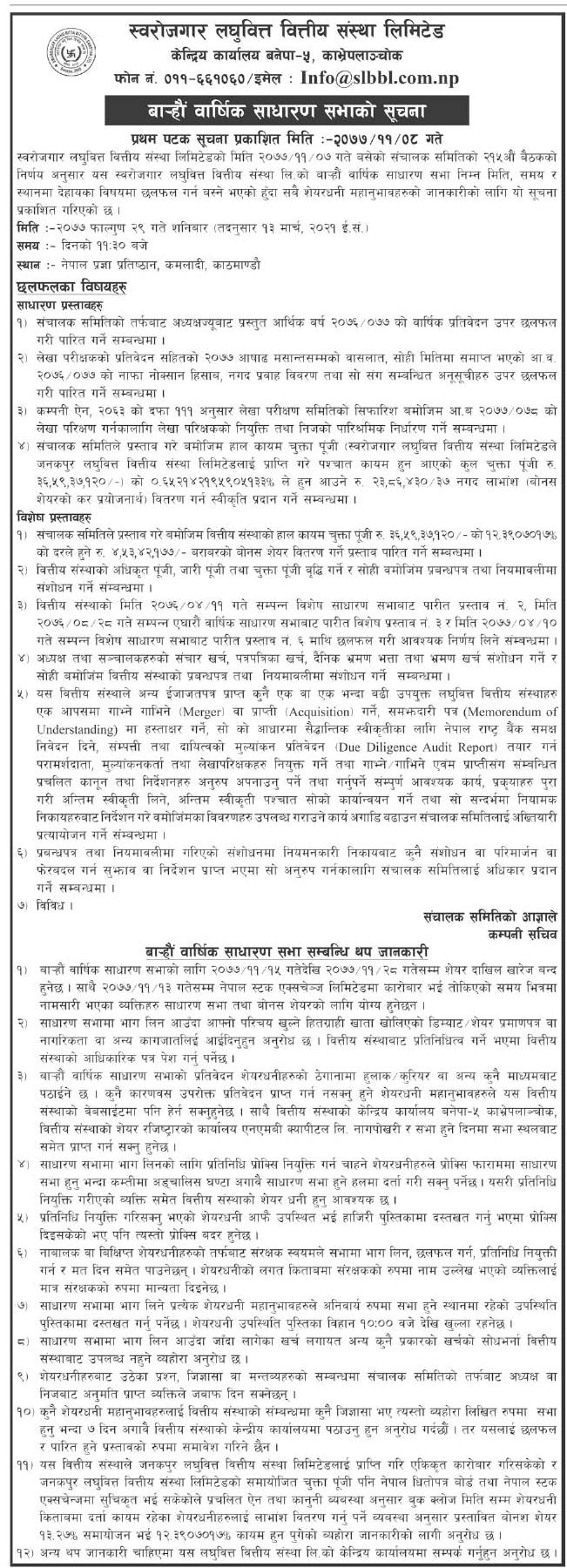 काठमाडौं । स्वरोजगार लघुवित्त वित्तीय संस्था लिमिटेडले साधारण सभा फागुन २९ गते वार्षिक साधारण सभा आह्वान गरेको छ । संस्थाको फागुन ७ गते, शुक्रबार बसेको सञ्चालक समितिको बैठकले उक्त सभाको मिति तय गरेको हो । सभा नेपाल प्रज्ञा प्रतिष्ठान, कमलादी, काठमाडौँमा बिहान ११ः३० बजेदेखि सुरू हुने जनाएको छ ।
