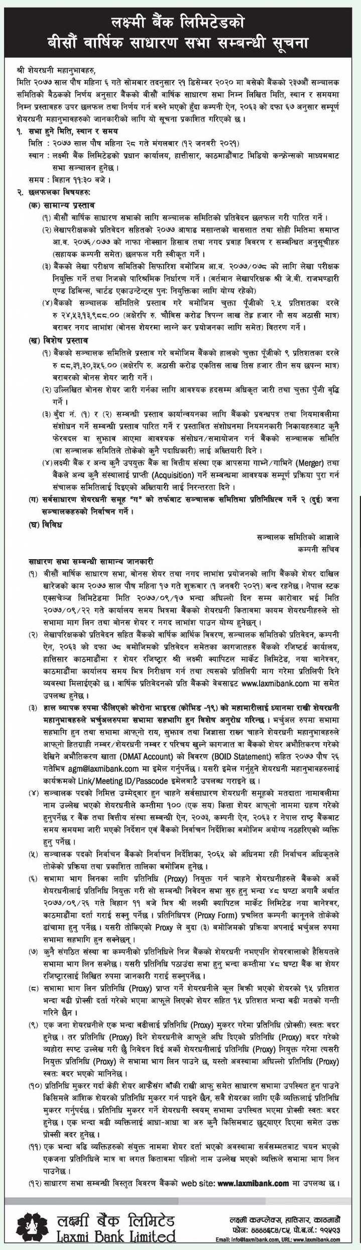 काठमाडौं । लक्ष्मी बैंक लिमिटेडले पुस २८ गते वार्षिक साधारण सभा आह्वान गरेको छ । बैंकको पुस ६ गते, सोमबार बसेको सञ्चालक समितिको बैठकले गरेको निर्णय अनुसार बैंकको २०औं वार्षिक साधारण सभाको मिति तय गरेको हो । सभा बैंकको प्रधान कार्यालय, हात्तीसार, काठमाडौँमा बिहान ११ः३० बजेबाट भर्चुअल माध्यमबाट सञ्चालन हुने बैंकले जनाएको छ ।