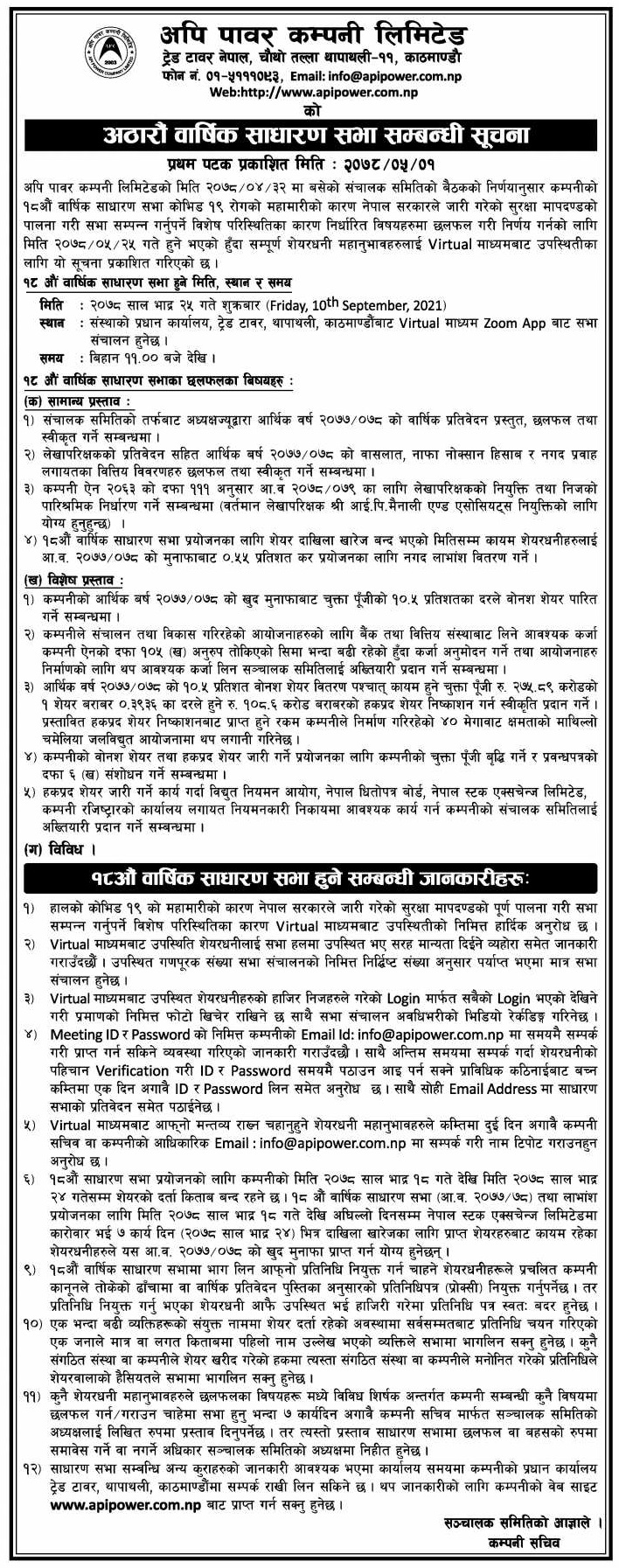 काठमाडौं । अपि पावर डेभलपमेन्ट कम्पनी लिमिटेडले अठारौ वार्षिक साधारण सभा भाद्र २५ गते, शुक्रबार गर्ने भएको छ । कम्पनीको साउन ३२ गते, सोमबार बसेको सञ्चालक समितिको बैठकले उक्त सभाको मिति तय गरेको हो । सभा कम्पनीको कम्पनीको प्रधानकार्यालय, ट्रेडटावर काठमांडौबाट भर्चुअल माध्यमबाट सञ्चालन हुने कम्पनीले जनाएको छ ।